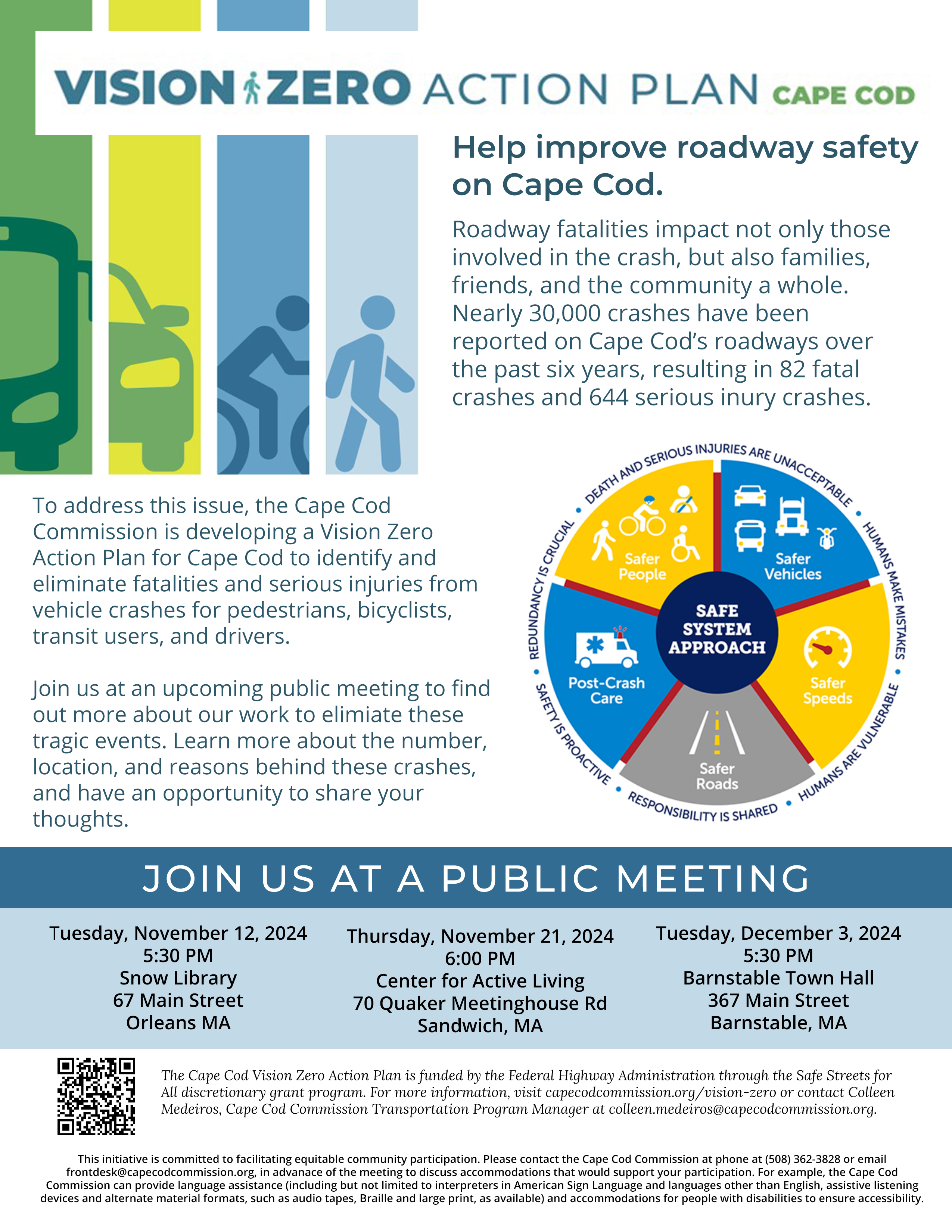 The Cape Cod Commission is developing a Vision Zero Action Plan for Cape Cod to improve road safety and address traffic fatalities. Join a public meeting at Snow Library on 11/12 at 5:30p to learn more. Read on for details!